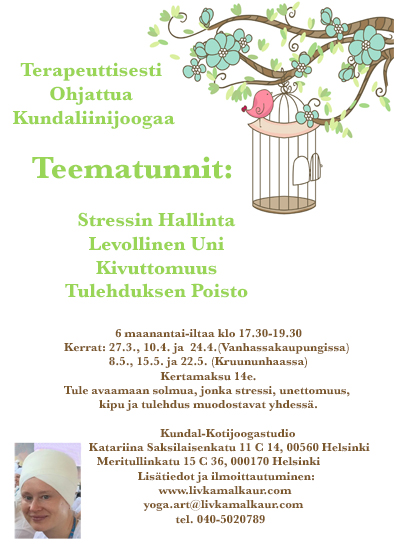Kerrat ovat torstaisin klo 17.15-18.45 5.4.-17.5. 2018. 11 euroa kerta. Joogatunnit pidetään Elpymössä, Kumpulassa. Väinö Auerinkatu 7, th 5, 00560 Helsinki. Ilmoittautumiset ja lisätiedot s.postitse: livkamalkhalsa@gmail.com Puhelinnumero 040-5020789 alkaa toimimaan 1.3. alkaen, s.postitse voi ilmoittautua ja olla yhteydessä jo aikaisemmin.