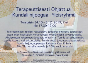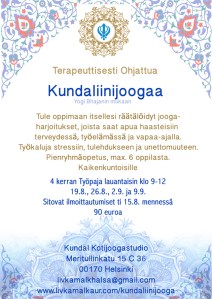 Terapeuttisesti Ohjattua Kundaliinijoogaa. Pienryhmäopetus. Kaikenkuntoisille. Aikaisempaa joogataustaa ei tarvitse olla. Myös tuolijoogasta kiinnostuneille. Kurssi pidetään Kruununhaassa Kundal-KotiJoogaStudiossa, Meritullinkatu 15 C, 00170 Helsinki.