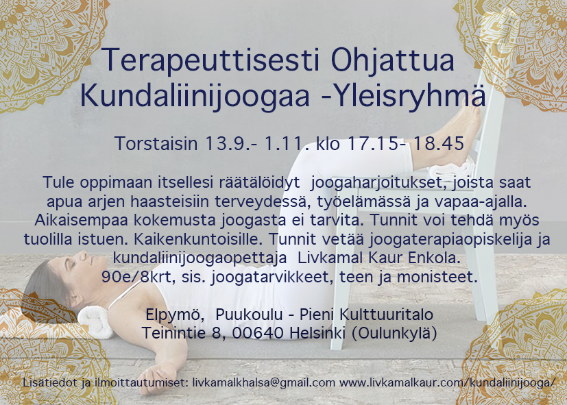 Torstaisin klo 17.15-18.45 13.9.-1.11. 2018. 90 euroa/ kurssi, sis. joogatarvikkeet, teen ja monisteet. Kurssi pidetään Elpymössä, Oulunkylässä Puukoululla, Teinintie 8 , 00640 Helsinki. Ilmoittautumiset ja lisätiedot s.postitse: livkamalkhalsa@gmail.com
