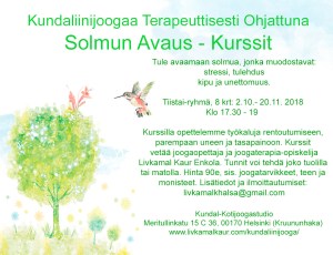 Solmun Avaus-Kurssilla perehdytään avaamaan solmua, jossa 4 tekijää kiinteästi ovat osallisina: stressi, tulehdus, unettomuus ja kipu. Kurssikerroilla käydään läpi ensin hieman aiheen teoriaa, jonka jälkeen tehdään harjoitteita solmun avaamiseksi. Kiinnitämme erityisesti huomiota niihin kundaliinijoogaharjoitteisiin, jotka vahvistavat kykyä kohdata stressiä. Jokainen opetuskerta on erilainen ja tuntien sisältö elää joogakurssille ilmoittautuneiden tarpeiden mukaan. Käymme läpi mm. rentoutumista, mielen toimintaa mantrojen ja meditaation yhteydessä, kokonaisvaltaisia joogaharjoitteita/kriyoja lempeästi ja rauhallisesti sekä hengittämistä. Terapeuttisesti ohjattu kundaliinijooga poikkeaa tavallisesta kundaliinijoogasta tuntien rakenteen, ohjaustyylin, harjoitteiden ja yleisen vaativuustason suhteen.