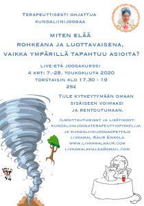 Terapeuttisesti Ohjatun Kundaliinijoogan etä-liveopetus alkaa to 26. maaliskuuta. Opetukseen voi osallistua kotikoneelta tai älypuhelimen kautta. Opetusfoorumina käytetään Zoomia. Zoom on netissä toimiva vuorovaikutteinen ryhmätyöfoorumi, joka mahdollistaa vastavuoroisuuden tietokoneen kameran ja mikrofoonin avulla sekä chattiboksin kautta.