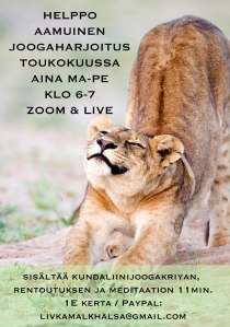 Uusi joogaryhmä starttaa Rajamäellä/Nurmijärvellä ja Zoomissa keskiviikkoisin klo 17.30 – 19. Alkaa keskiviikkona 5. tammikuuta ja jatkuu koko vuoden 2022. Lomapäivät opetuksessa ovat: 2.3., 16.3., 30.3., 27.4. ja 11.5.