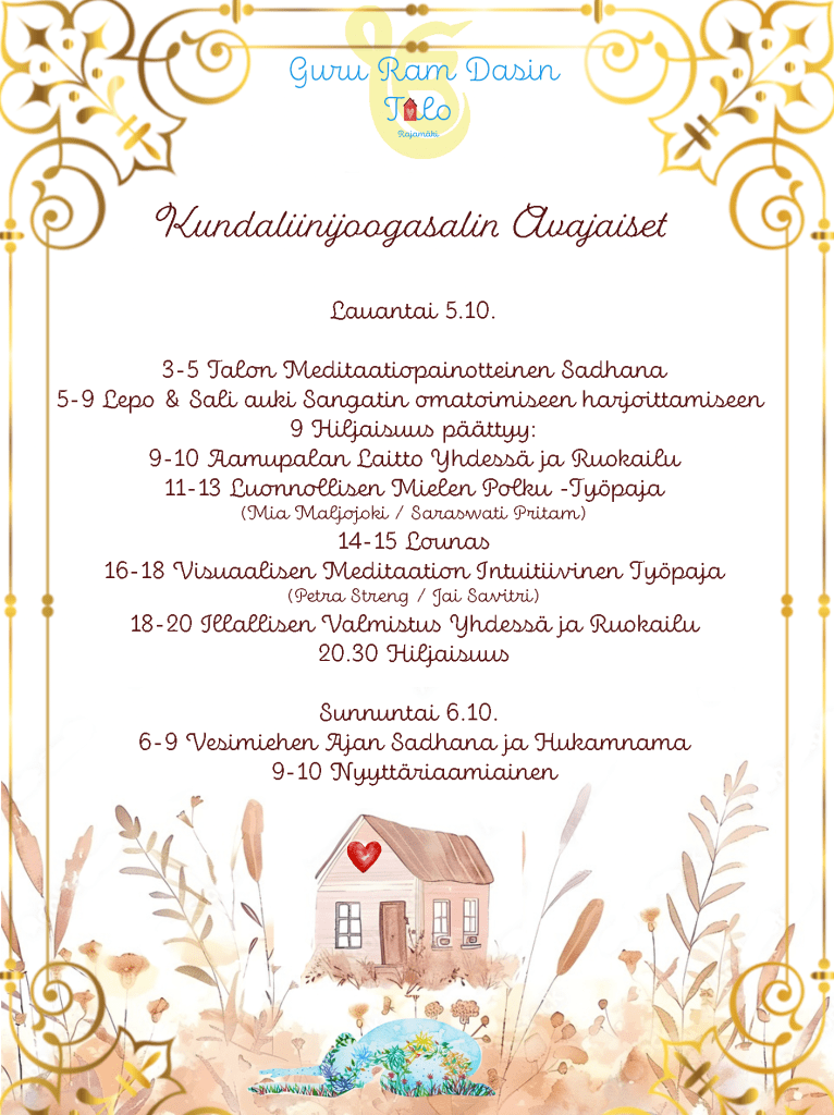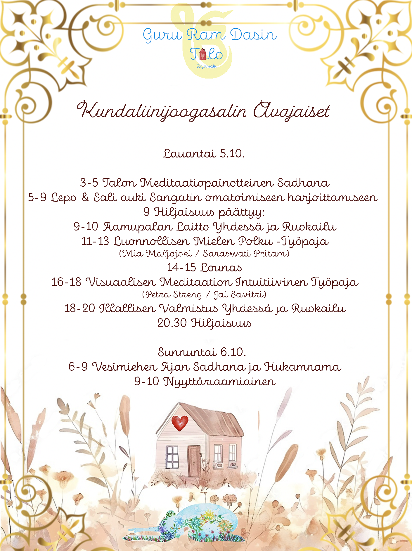 Lämpimästi tervetuloa kundaliinijoogaperinteen aamusadhanoihin marraskuussa joka viikonloppu klo 5.00 – 7.30. Voit tulla mukaan kun itsellesi parhaiten sopii ja lähteä myös koska itsellesi parhaiten passaa. Aamuharjoitus alkaa Japji-resitaatiolla ( oma Japji ). Resitaation jälkeen päättämme yhdessä tehtävän Kriyan. Kriya päättyy rentoutukseen, jonka jälkeen on tunnin mittainen mantra-meditaattio, ns. Aquarian Age mantrat livemusiikilla. Kaikki saavat myös osallistua vetämään sadhanan eri osia niin halutessaan. Halukkaille tarjolla lopussa myös päivän hukamnama (ote Siri Guru Granth Sahibista). Sadhanat ovat zoomin kautta (ei ilmoittautumista) ja halutessaan voi tulla myös Rajamäelle/Nurmijärvelle paikan päälle (ilmoittautuminen tekstarilla 040-5020789 edelliseen iltaan klo 18 mennessä).
