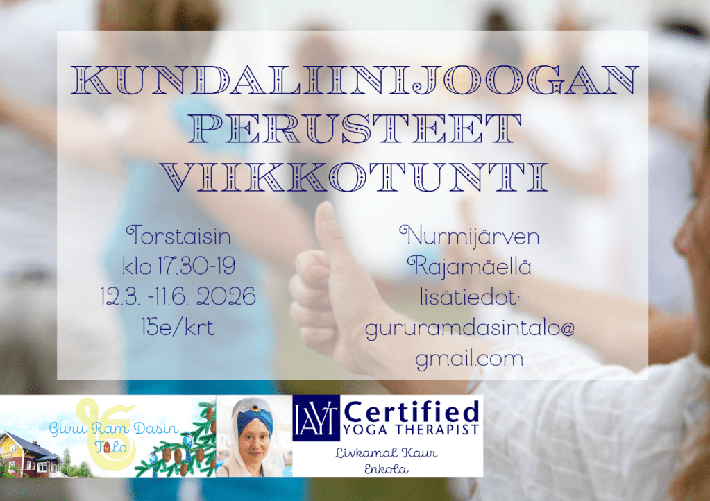 Kundaliinijoogan Perusteet Viikkotunti torstaisin klo 17.30 – 19 Guru Ram Dasin Talolla Rajamäellä. Kevätkausi on 12.3. – 11.6. 2026.